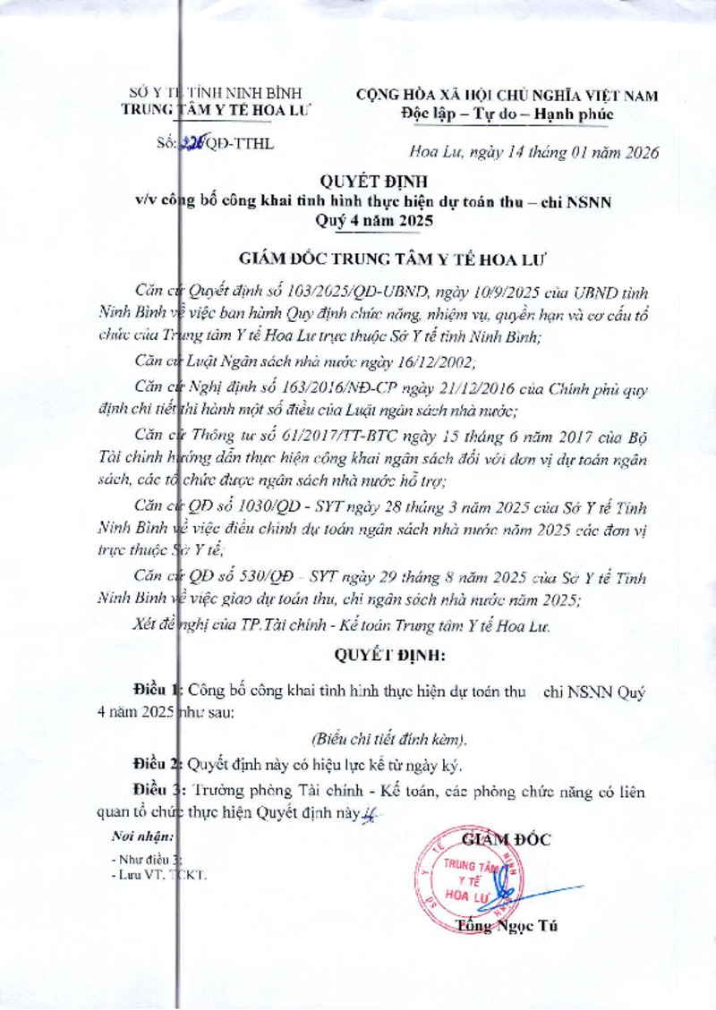 | Số hiệu | 26/QĐ-TTHL | Cơ quan ban hành | Trung tâm Y tế Hoa Lư |