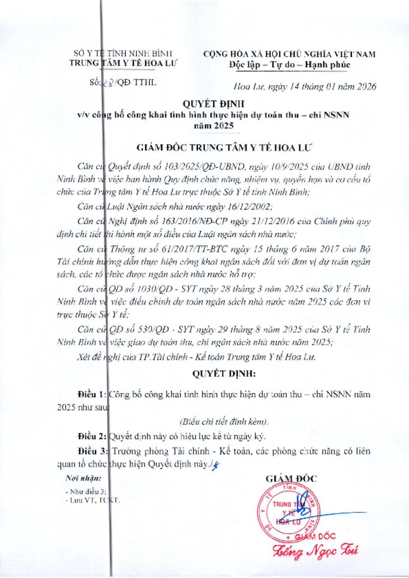 | Số hiệu | 28/QĐ-TTHL | Cơ quan ban hành | Trung tâm Y tế Hoa Lư |